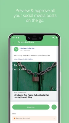 Loomly for Android allows you to: • Access all social media calendars & posts created in the Loomly web application. • Create new posts, preview posts, update post statuses, assign posts to collaborators, and comment on posts. • Receive push notifications anytime a post requires action.