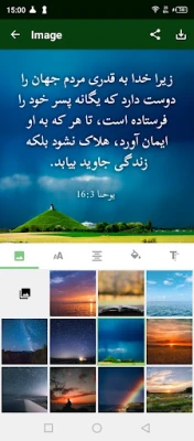 • وقتی روی یک آیه ضربه می زنید، یک دکمه تصویر در نوار ابزار پایین نشان داده می شود. هنگامی که این دکمه فشار داده می شود، صفحه "ویرایش تصویر" ظاهر می شود. می توانید تصویر پس زمینه را انتخاب کنید، متن را در اطراف تصویر جابه جا کنید، فونت، اندازه متن، تراز، قالب و رنگ را تغییر دهید. تصویر تمام شده را می توان در دستگاه ذخیره کرد و با دیگران به اشتراک گذاشت.