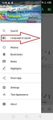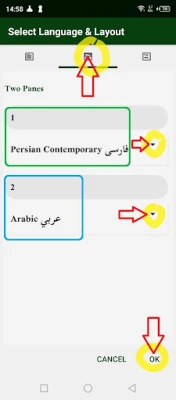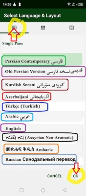 - "two panes" to display the Persian / Farsi at the top and the Kurdi, Azerbaijan, Turkish, Arabic, English, Aramaic, Amharic or Russian version at the bottom