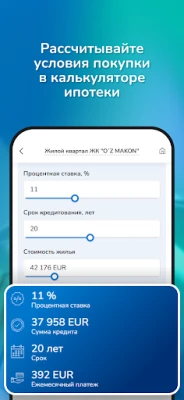 Используйте встроенный ипотечный калькулятор, чтобы рассчитать условия и подобрать оптимальные варианты финансирования.